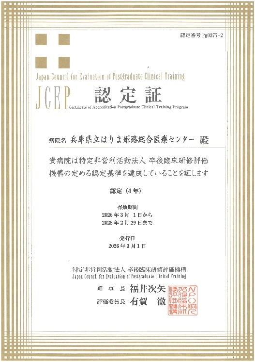 当院は、播磨姫路医療圏の中核病院として三次救急医療を含めた地域医療に貢献し、臨床研修については多数施設と連携を図りながら活発に取り組んでいること、研修医が自主的に臨床研修を実践できていることなど、意欲的で特色的な点を高く評価され、今回の認定につながりました。
