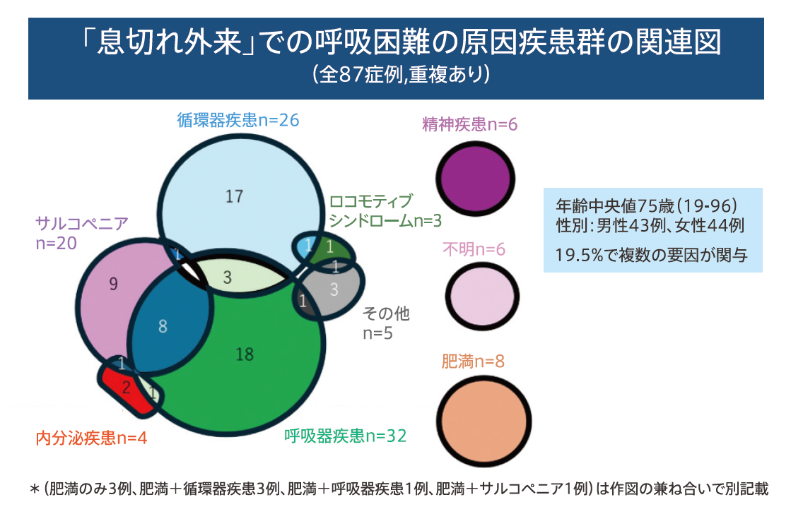 2022年10月に開設した「息切れ外来」ですが、約1年半で87名の患者さんをご紹介いただきました。基礎疾患で最も多かったのは呼吸器疾患(全体の36.8%)で、COPDと気管支喘息が中心(併せて84.4%)でした。循環器疾患は29.9%で、肺高血圧やHFpEF、狭心症などが主な原因でした。新たな発見として、息切れ