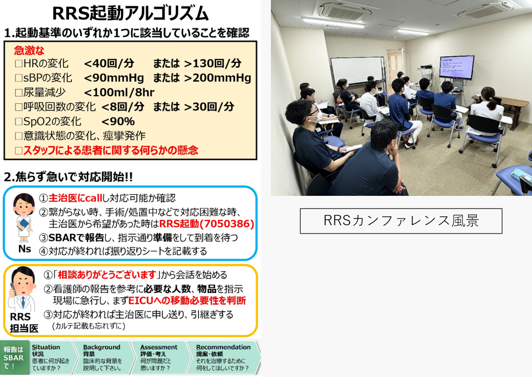 RRSとは、院内急変対応システムRapid Response System(ラピッドレスポンスシステム) の略です。入院中の患者さんに対 して、状態が重篤になる前に早期に介入しよう!というものです。当院はRRSチームが発足して活動を行っています。