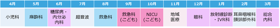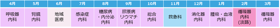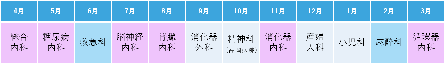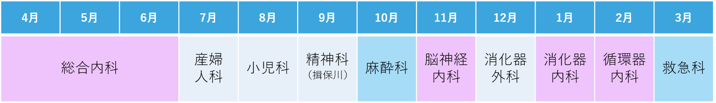 | 午前 | 救急患者対応 | 総合内科カンファ | 病棟研修 | 総合内科カンファ | モーニングレクチャーレントゲン道場 |