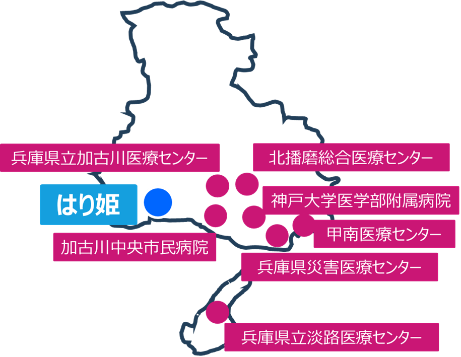兵庫県立はりま姫路総合医療センターを基幹病院とし、播磨、淡路、神戸にある連携施設とによるプログラムです。