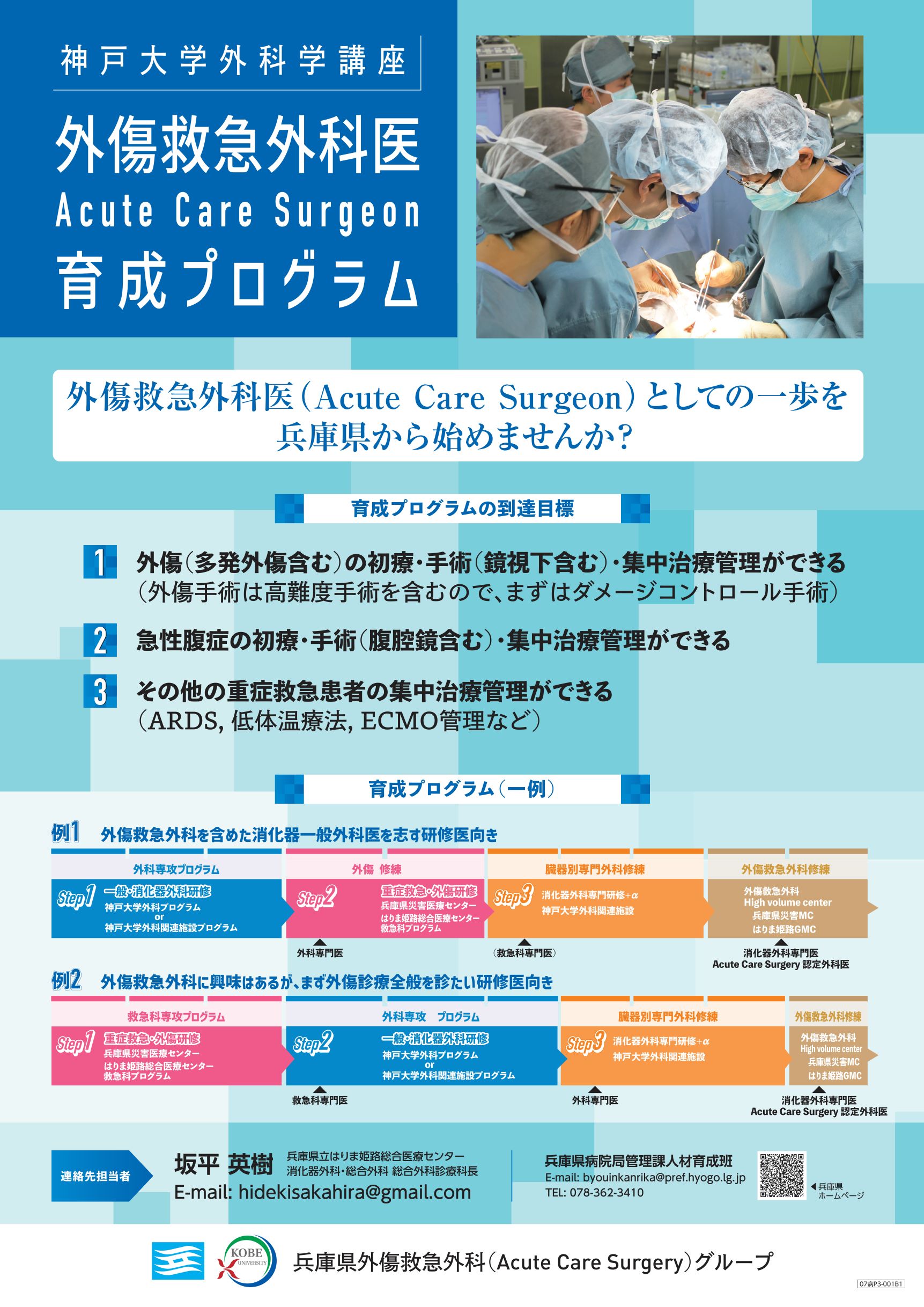 また、当院には3次救急まで担う救命救急センターも開設していることから、神戸大学外科学講座・兵庫県病院局の協力のもと外傷救急外科医育成プログラムも内設しています(https://web.pref.hyogo.lg.jp/bk02/gaisyoukyukyu.html)。